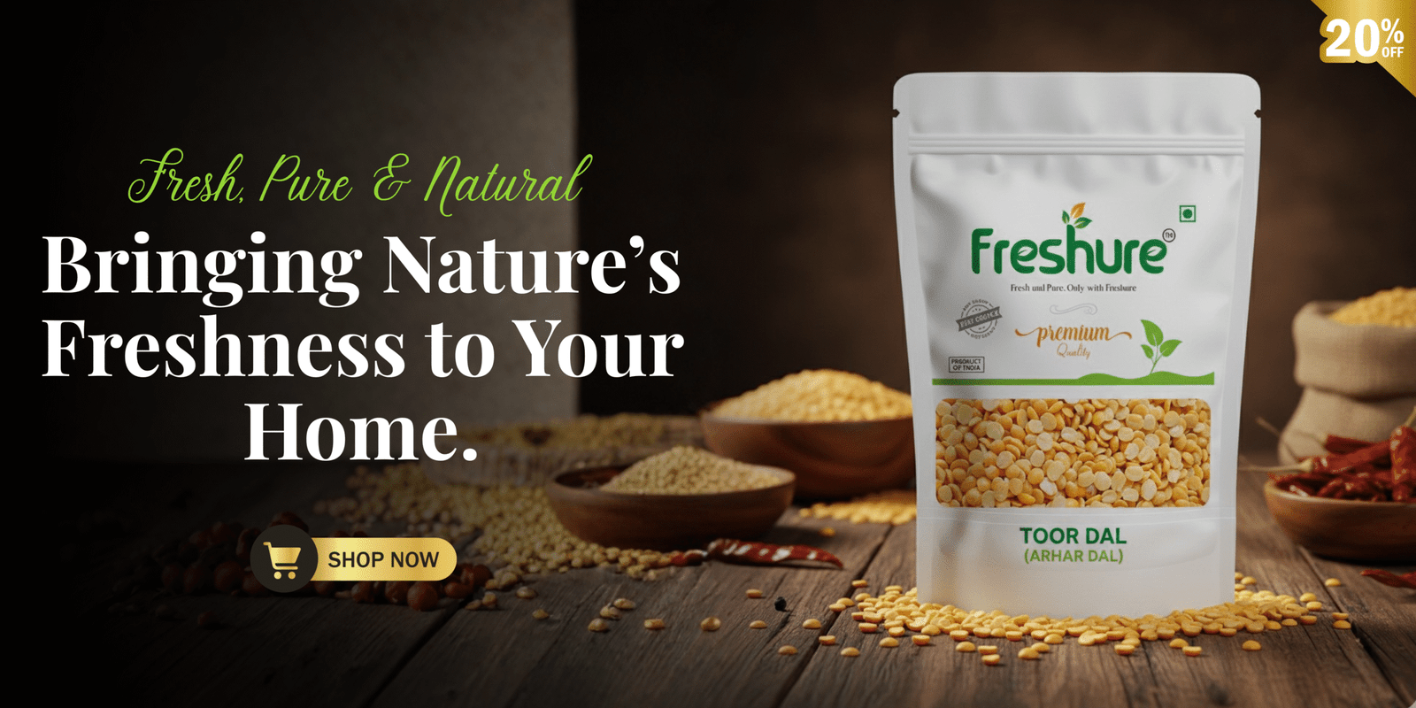 We are Freshure a premium FMCG brand delivering pure, natural, and unadulterated essentials for your kitchen. Our products are directly sourced from trusted farms, hygienically processed, and packed with aroma-lock technology to preserve freshness. We focus on clean, chemical-free ingredients that bring authentic taste and purity to your everyday cooking. Freshure stands for quality you can trust and freshness your family can rely on.