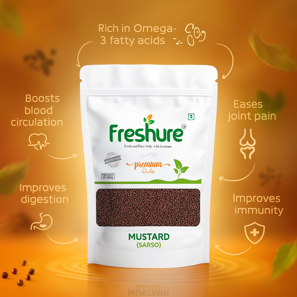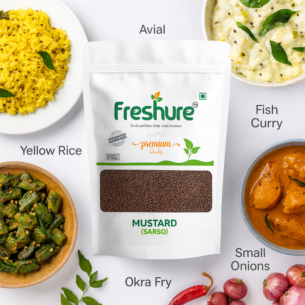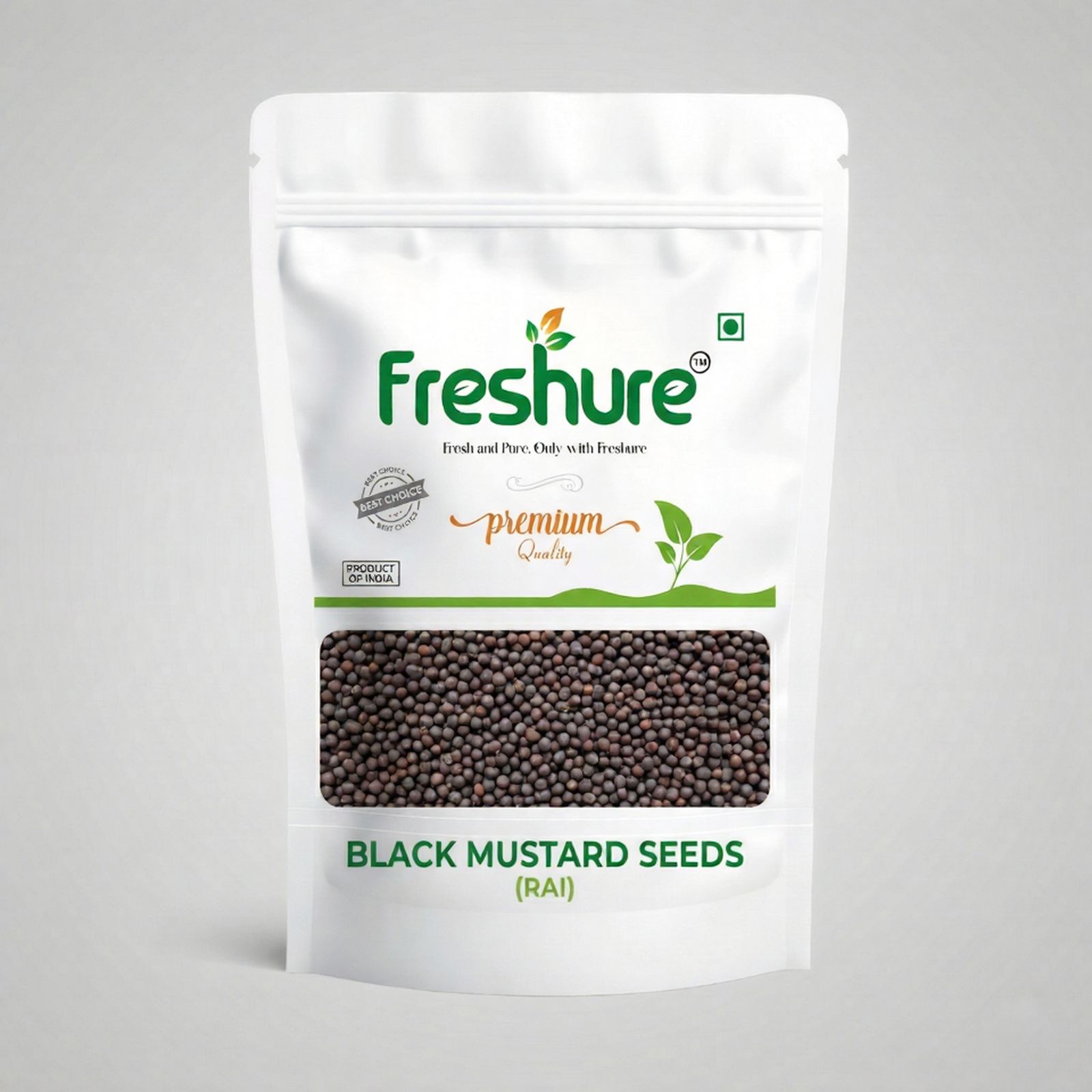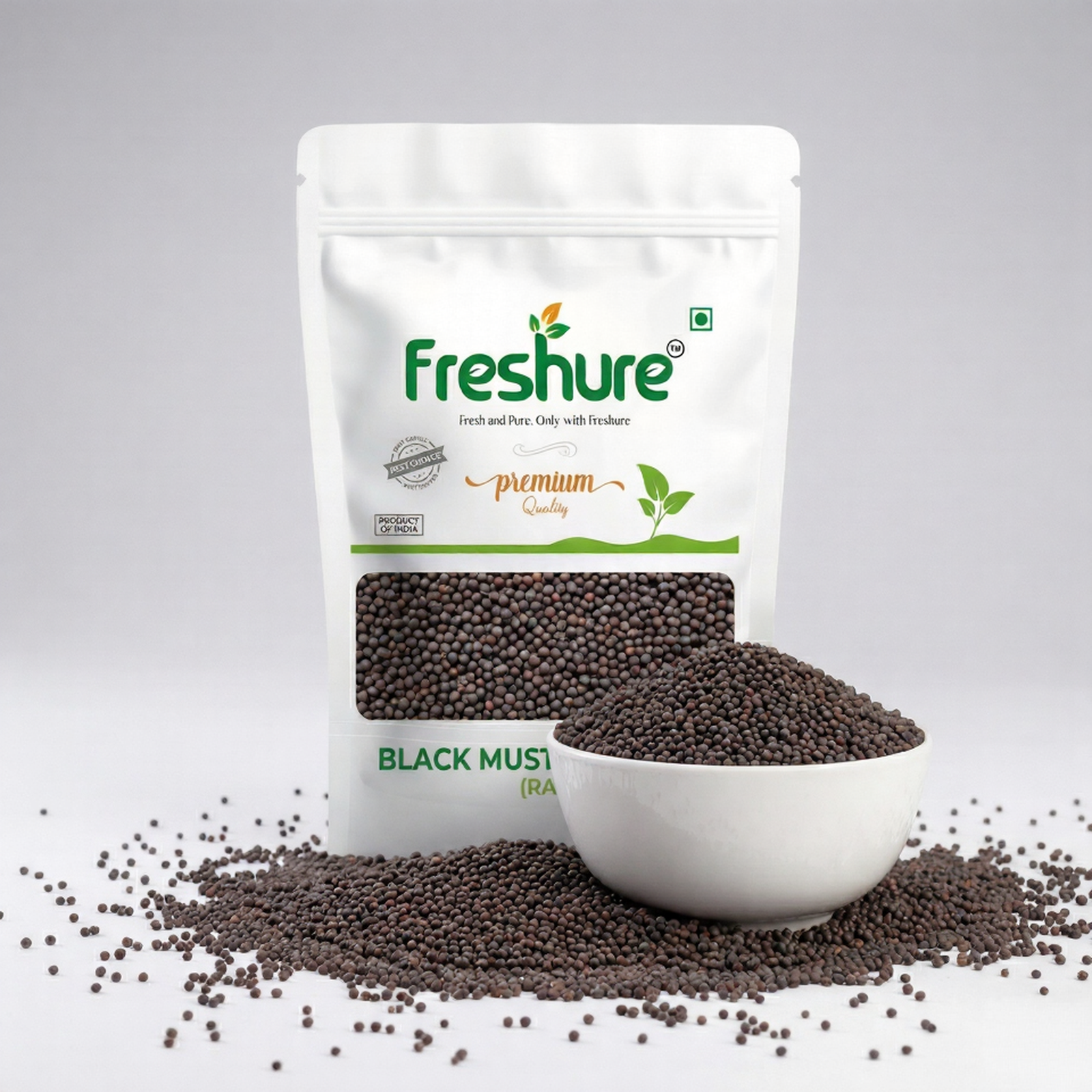 Freshure Black Mustard Seeds, commonly known as Kali Sarson or Rai, are carefully sourced from quality farms and naturally processed to retain their sharp pungency, rich aroma, and natural oil content. These premium whole mustard seeds are thoroughly cleaned and left unpolished to preserve their authentic taste and freshness.
