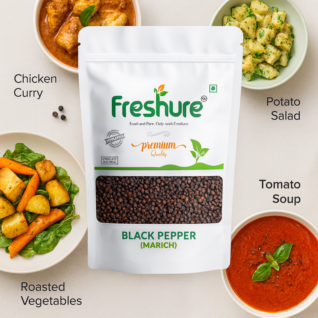 Widely used in Indian and global cuisines, Freshure Black Pepper adds heat and depth to curries, gravies, soups, salads, marinades, and spice blends. When freshly ground or used whole, the peppercorns release a strong aroma and intense flavor that enhances both everyday and gourmet recipes.