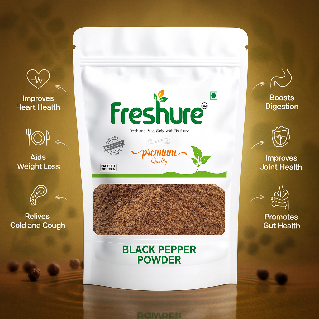 Freshure Black Pepper Powder is made from carefully selected, sun dried black peppercorns known for their sharp aroma, natural heat, and bold flavour. The peppercorns are thoroughly cleaned and finely ground to retain their essential oils, freshness, and authentic taste.