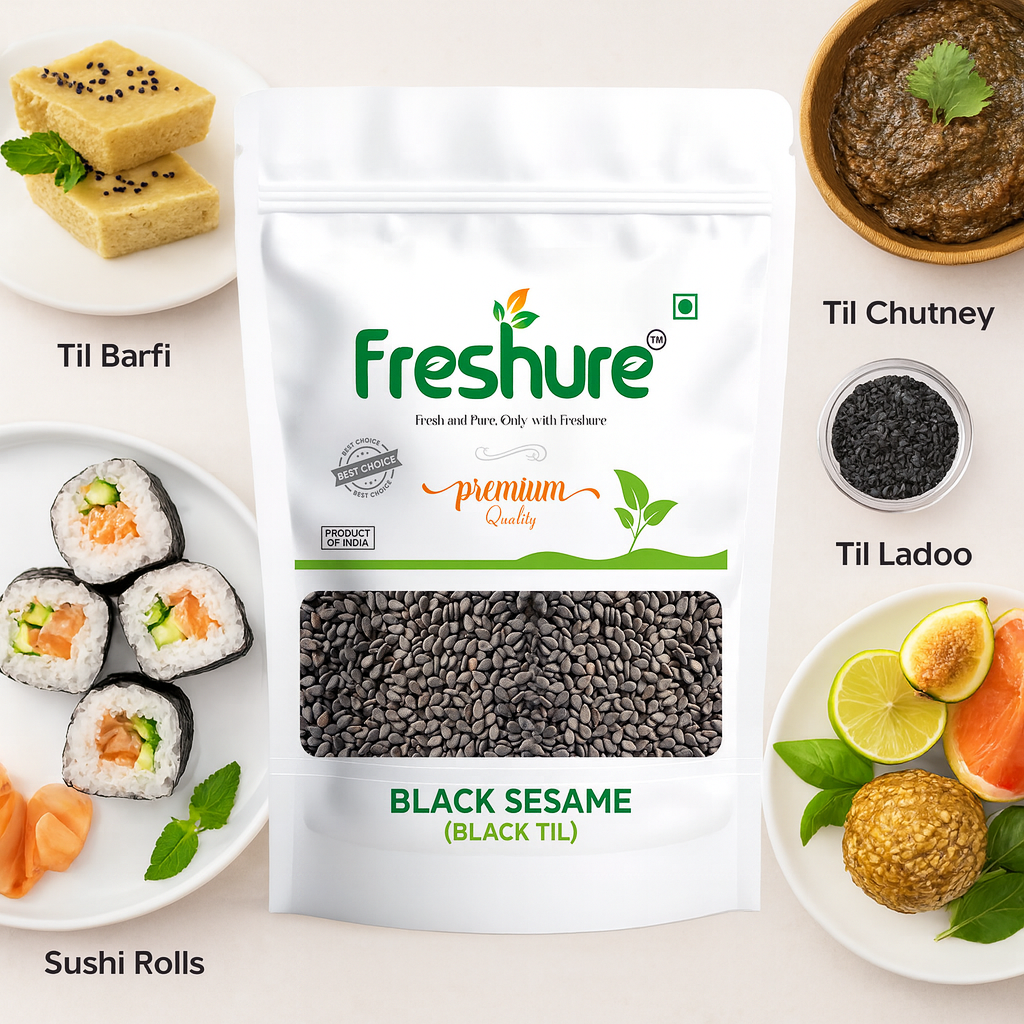 Naturally rich in healthy fats, plant protein, calcium, iron, and essential minerals, Freshure Black Sesame Seeds are widely used in Indian cooking for sweets, laddoos, chutneys, tempering, traditional recipes, and Ayurvedic preparations. Their bold flavor and dark color make them ideal for both savory dishes and festive sweets.