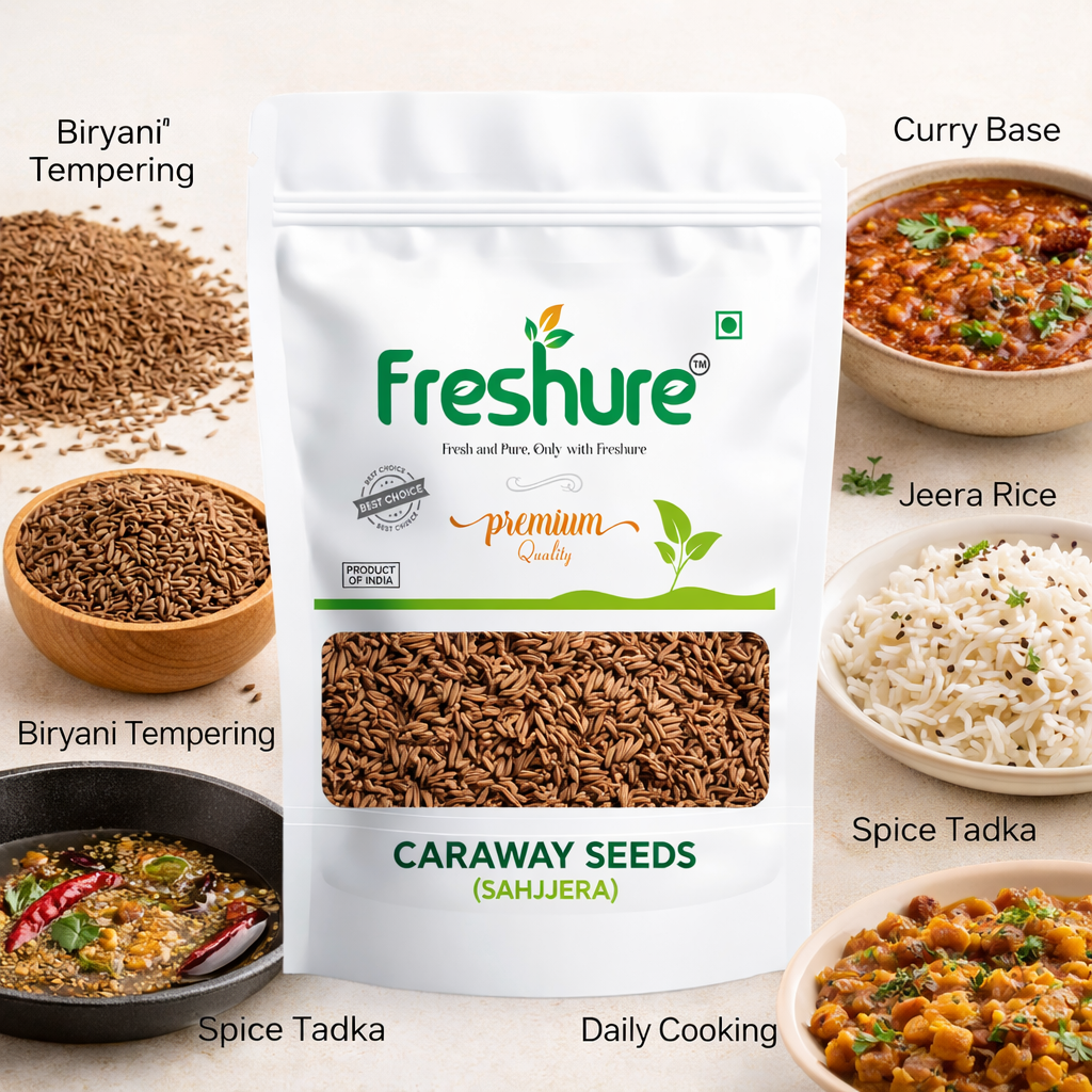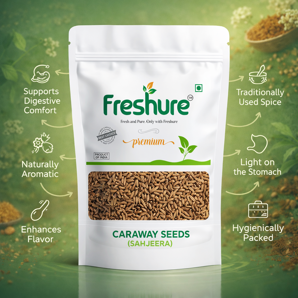 Freshure Caraway Seeds, commonly known as Shah Jeera or Kala Jeera, are premium quality aromatic seeds carefully sourced and naturally processed to retain their distinct warm aroma and mildly sweet, earthy flavor. These seeds are thoroughly cleaned and left unpolished to preserve their natural oils and authentic taste.