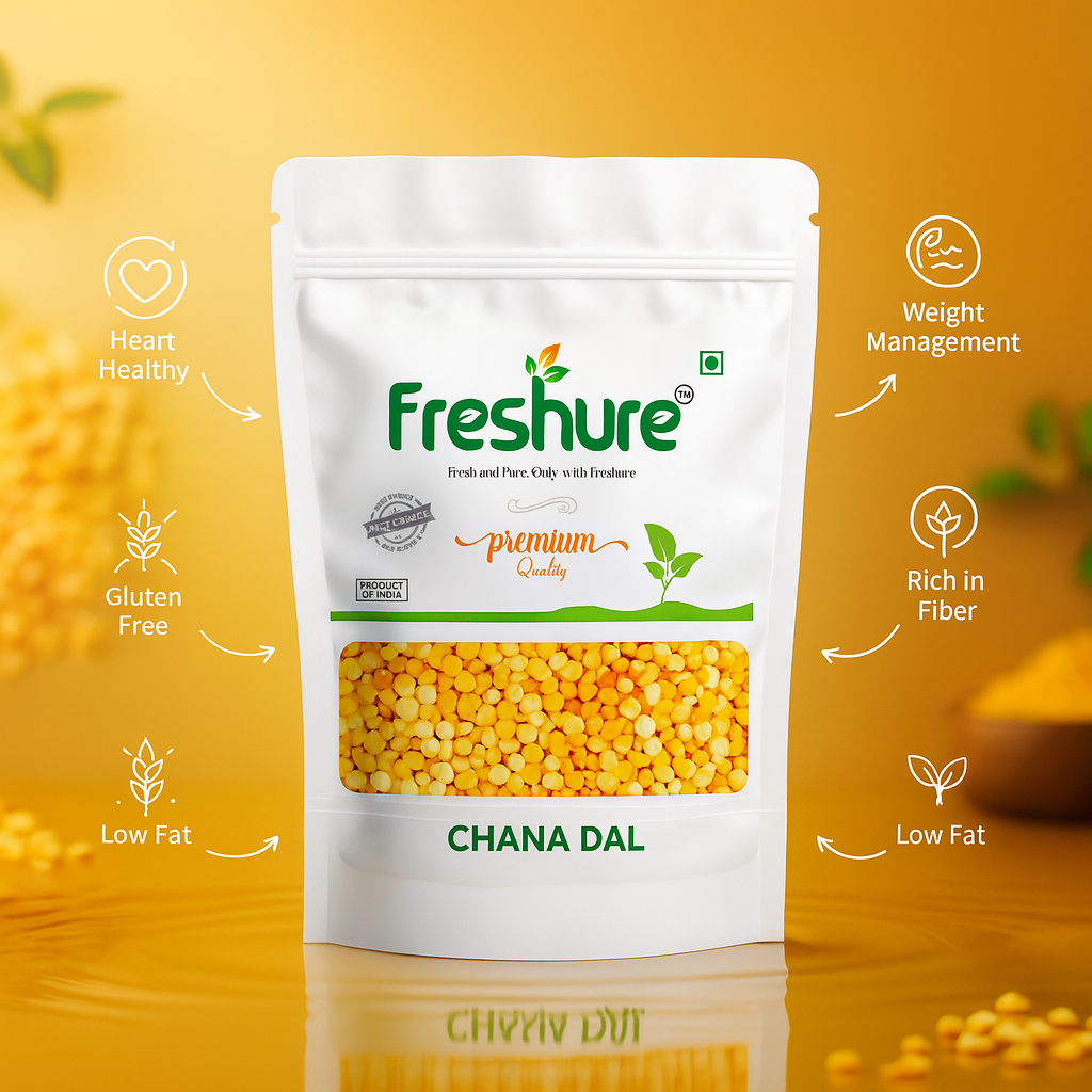 Freshure Chana Dal, also known as Split Bengal Gram, is sourced from quality farms and naturally processed to preserve its authentic taste, aroma, and nutrition. These premium lentils are unpolished and carefully cleaned, ensuring better texture, rich flavor, and consistent cooking quality.