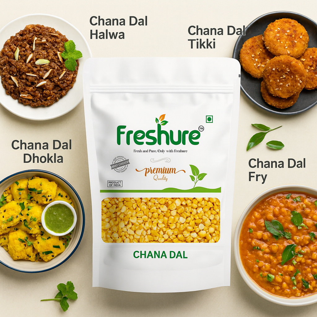Naturally rich in plant protein, dietary fiber, and essential nutrients, Freshure Chana Dal is ideal for everyday Indian cooking. It is widely used in traditional dishes like dal, chana dal fry, curries, snacks, sweets, and South Indian preparations. The grains cook evenly, maintaining a firm yet soft bite after cooking.