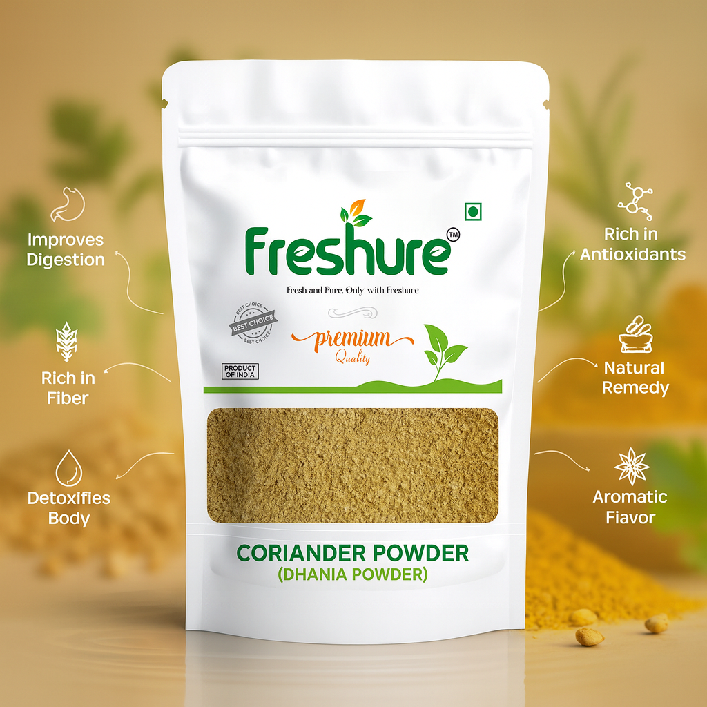Freshure Dhaniya Powder is made from carefully selected, mature coriander seeds known for their fresh aroma and mild citrusy flavour. The seeds are cleaned thoroughly and finely ground using controlled processes to retain their natural oils, colour, and authentic taste.