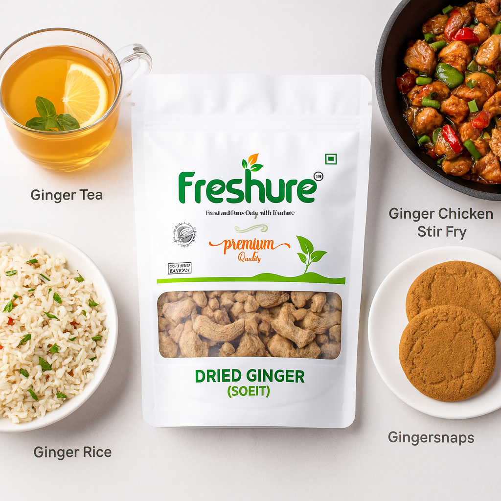 Freshure Dry Ginger, commonly known as Sonth or Saunth, is made from carefully selected ginger roots that are naturally dried to preserve their strong aroma, warm pungency, and nutritional value. This premium quality dry ginger is thoroughly cleaned and processed to retain its authentic taste and natural oils.
