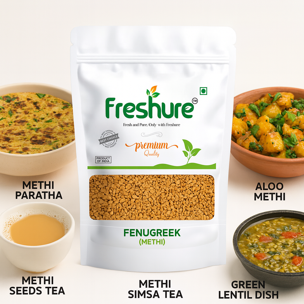Fenugreek seeds are widely used in Indian cooking for tempering, pickles, spice blends, curries, and traditional recipes. Known for their distinctive slightly bitter taste and strong aroma, Freshure Fenugreek Seeds enhance both flavor depth and nutritional value of everyday meals.