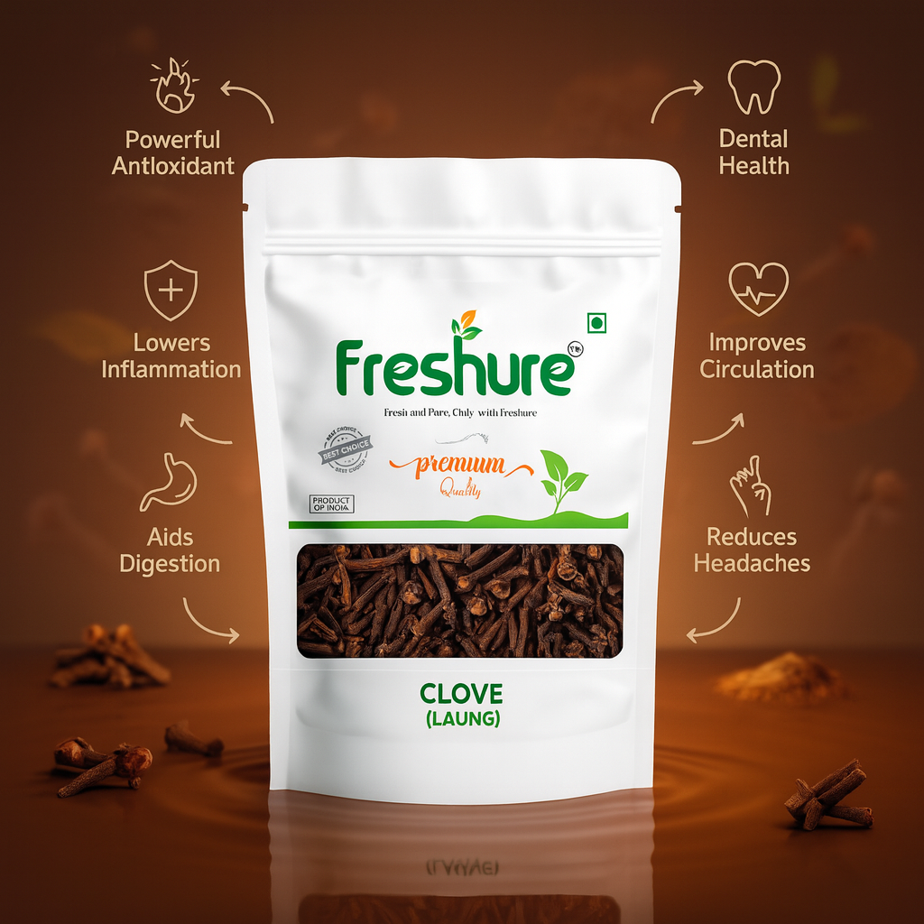Freshure Laung, also known as Cloves or Lavang, are premium whole flower buds carefully sourced from quality growing regions and naturally dried to retain their strong aroma, rich oil content, and authentic flavor. These whole cloves are thoroughly cleaned and left unpolished to preserve their natural potency and freshness.