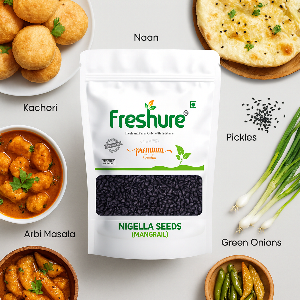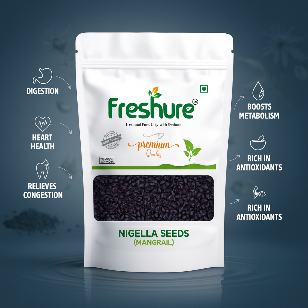 Freshure Nigella Seeds, popularly known as Kalonji or Mangrail, are carefully sourced from quality farms and naturally processed to retain their distinct aroma, slightly bitter peppery taste, and nutritional value. These premium whole seeds are thoroughly cleaned and left unpolished to preserve their natural oils and authentic flavor.