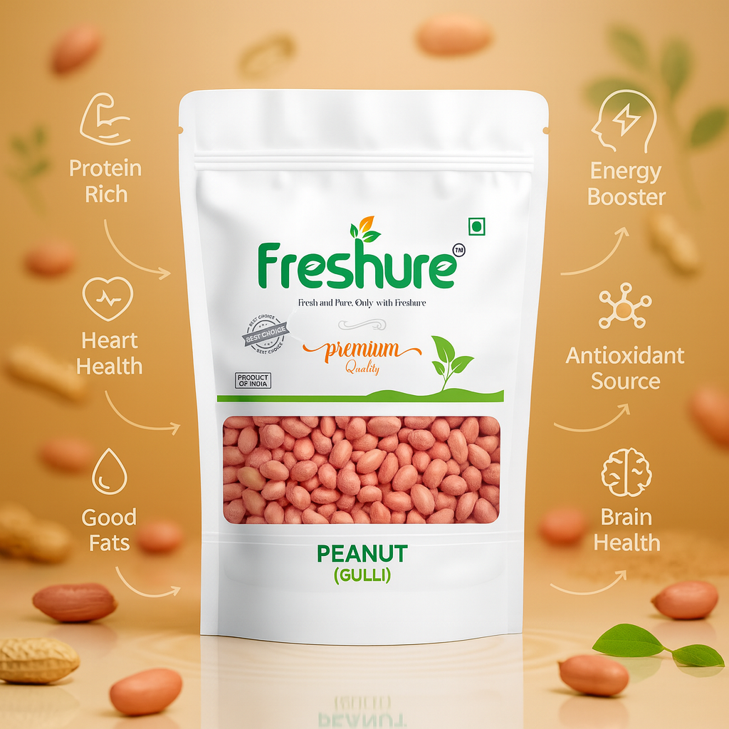 Freshure Peanuts (Groundnut) are sourced from quality farms and carefully processed to maintain their natural flavour and crunch. Each batch is cleaned and graded to ensure uniform size, taste, and quality, making them suitable for everyday household use.