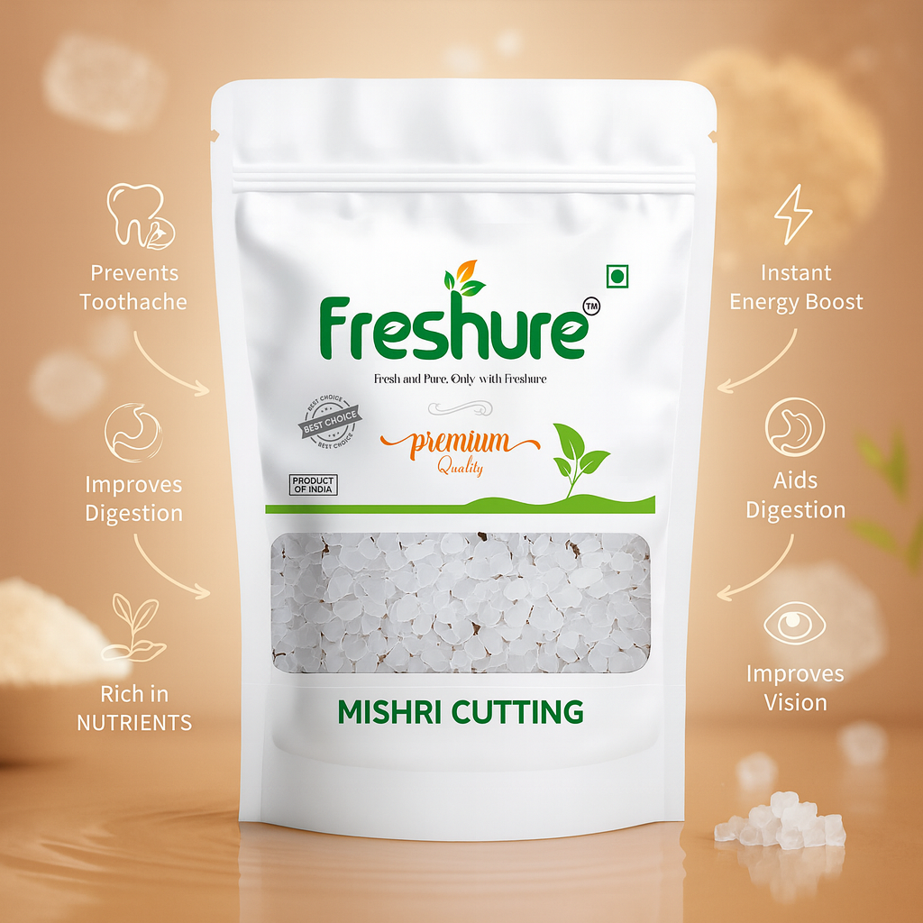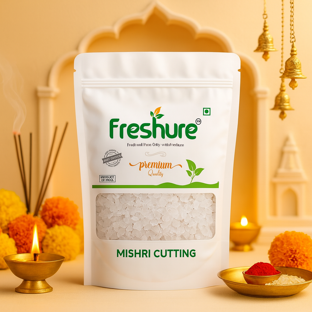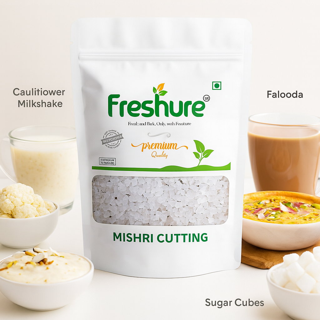 Freshure Sugar Candy Cutting (Mishri Cutting) is prepared using a controlled crystallization process that produces clean, broken sugar crystals with a balanced natural sweetness. Known for its versatility, mishri cutting is commonly used in milk, herbal drinks, desserts, and religious offerings.