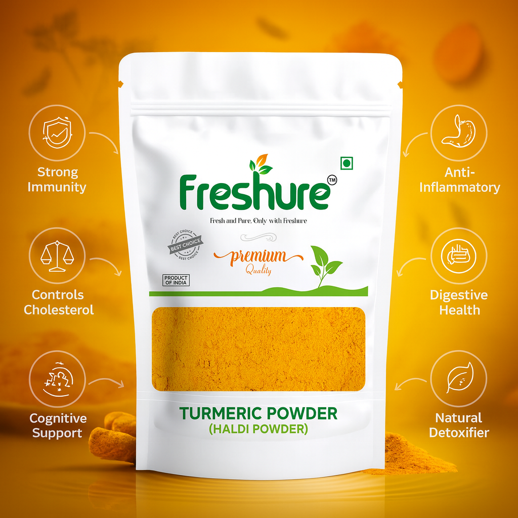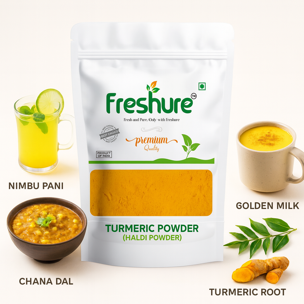 Freshure Haldi Powder is made from carefully selected, high curcumin turmeric roots to deliver rich colour, strong aroma, and authentic taste. Finely ground and hygienically packed, this pure turmeric powder enhances everyday cooking while supporting natural immunity and digestion. Ideal for curries, dals, vegetables, milk, and traditional remedies, Freshure Haldi Powder brings freshness and purity straight from farm to kitchen.