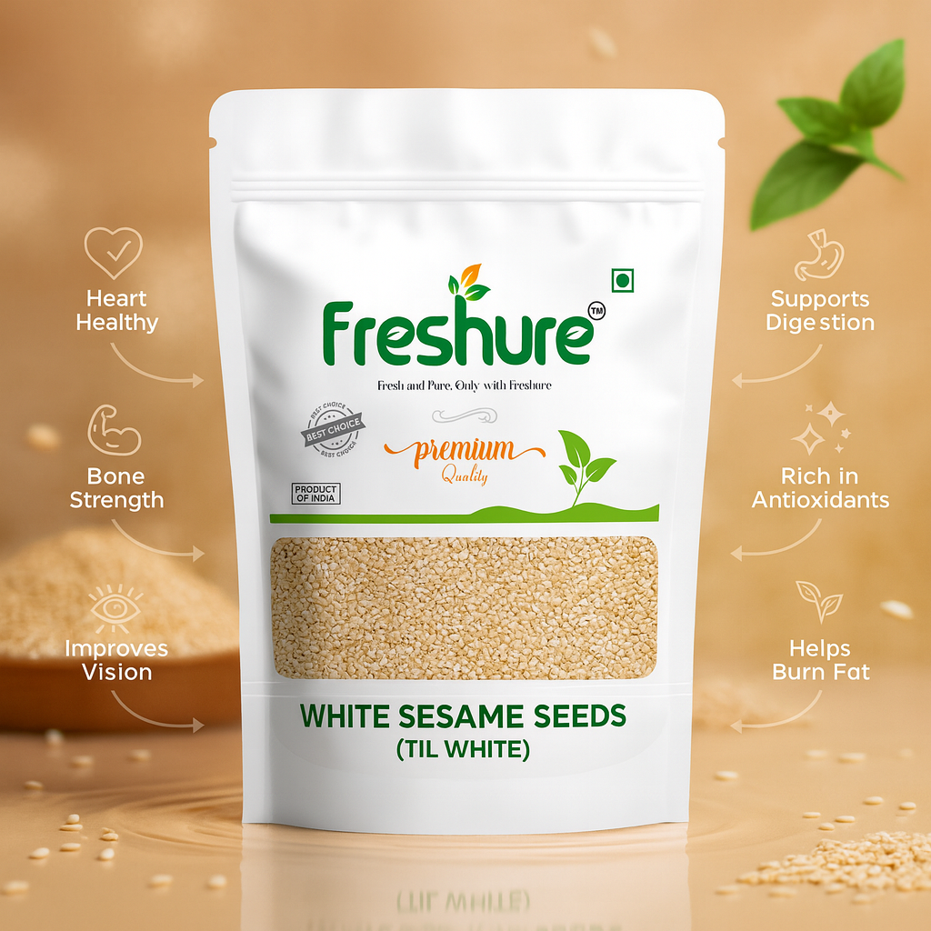 Naturally rich in healthy fats, plant protein, calcium, and essential minerals, Freshure White Sesame Seeds are widely used in Indian cooking for tempering, sweets, laddoos, chutneys, tahini, bakery items, and traditional recipes. Their light color and subtle flavor make them ideal for both savory and sweet preparations.