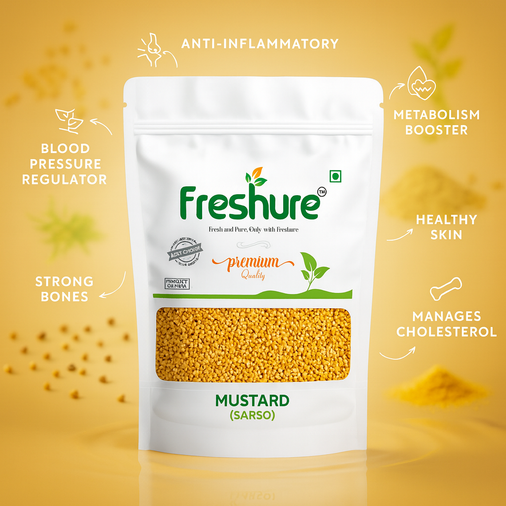Freshure Yellow Mustard Seeds are carefully sourced from quality farms and naturally processed to retain their original aroma, flavor, and nutritional value. Commonly known as Yellow Sarson or Peeli Sarson, these premium mustard seeds are thoroughly cleaned and unpolished to preserve their natural oils and authentic taste.